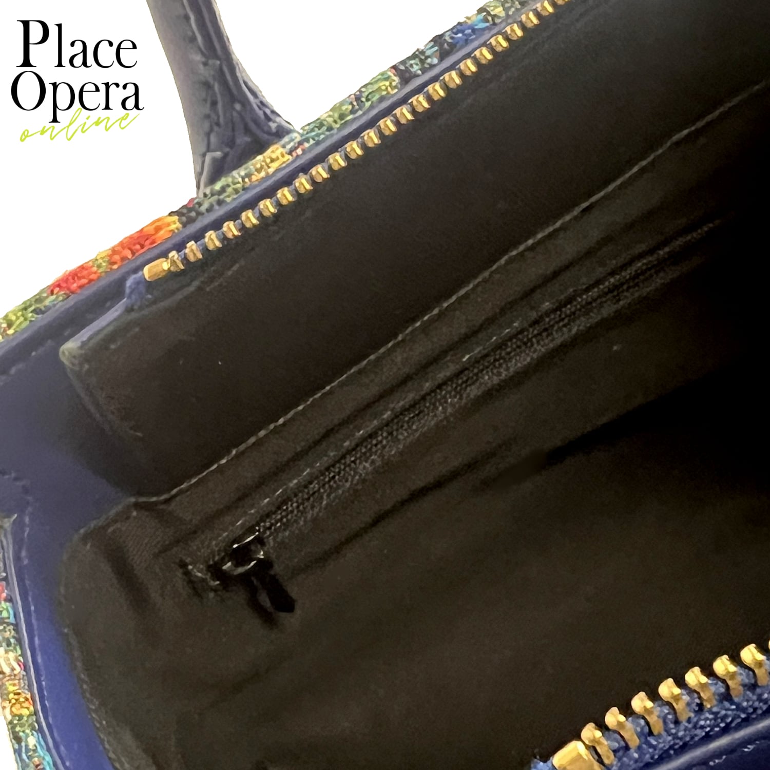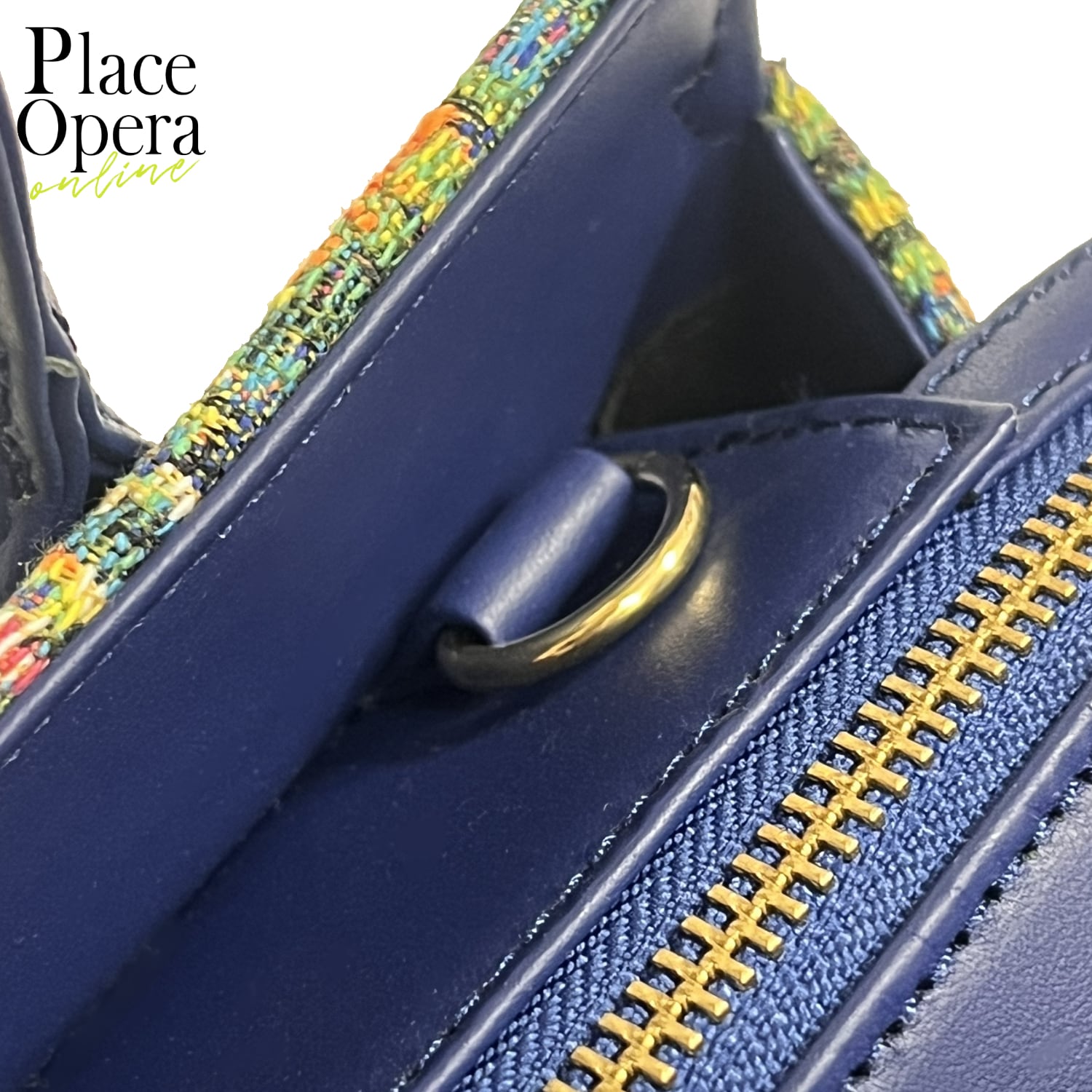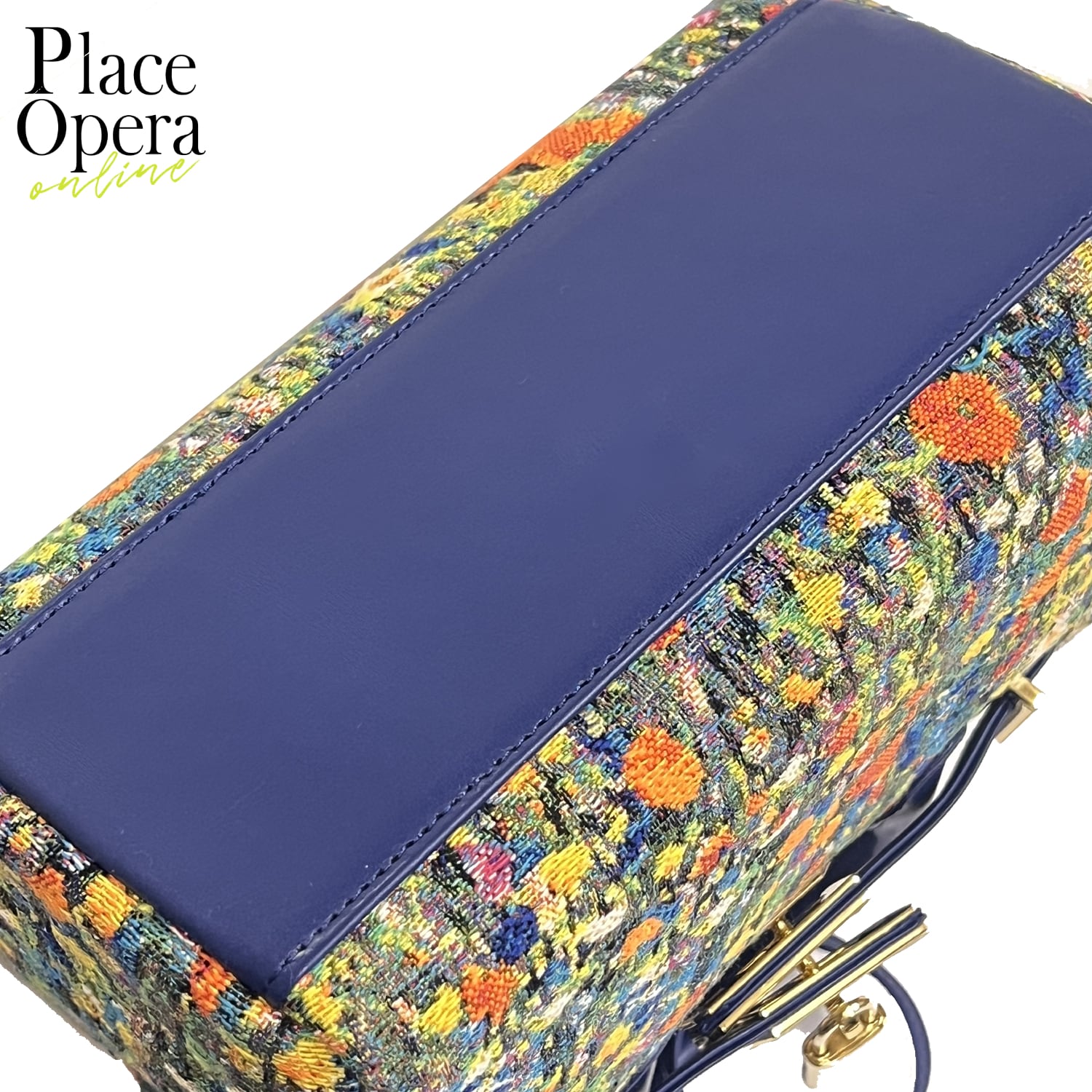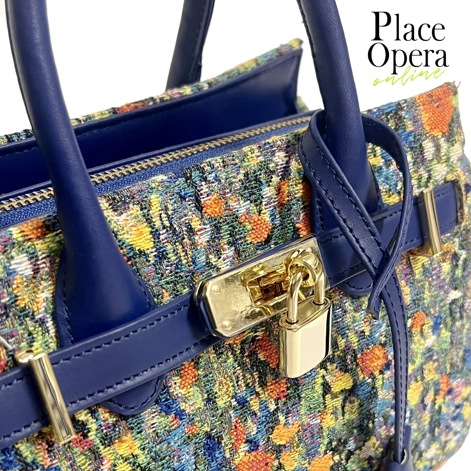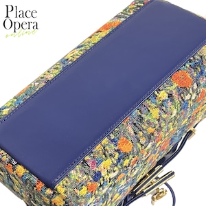 深みのあるネイビーの本革ハンドルとショルダーストラップが、繊細な織り柄を美しく引き締め、全体に凛とした印象を添えています。手持ちと肩掛けの2WAY仕様で、シーンに応じた使い分けも自在です。