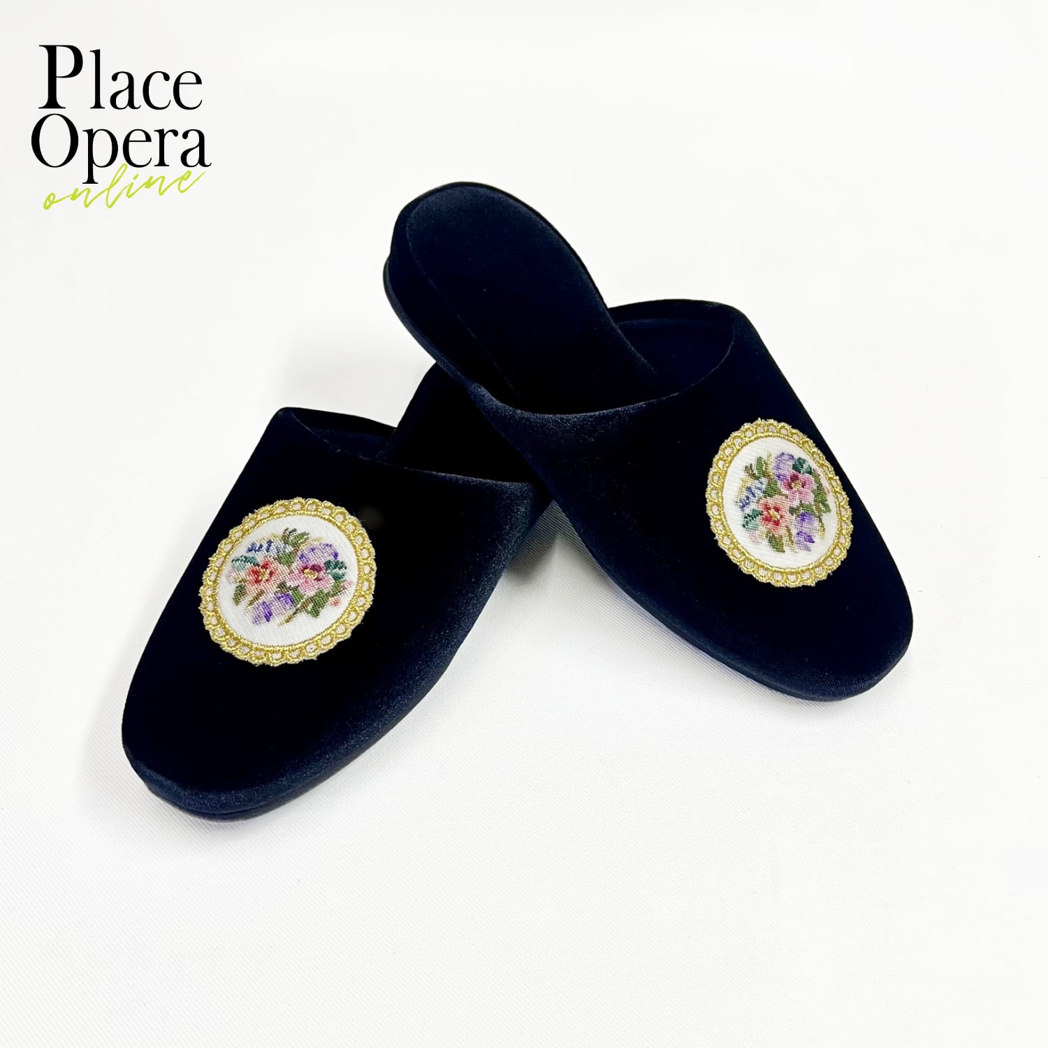 光沢ある生地と刺繍の美しさ。特別な日のためのスリッパです。